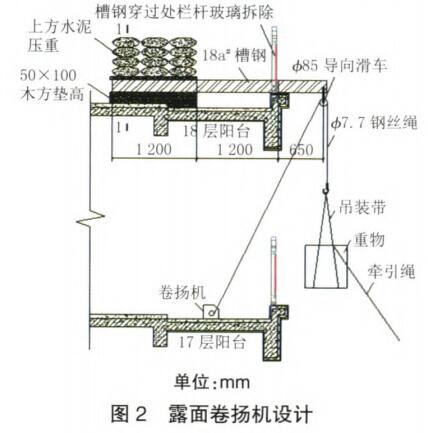 高層住宅一共18層,將卷揚機(jī)安裝在第17層陽臺板上,卷揚機(jī)通過M10×85膨脹螺栓與樓板固定在一起;槽鋼梁與導(dǎo)向滑車固定在18層陽臺板上,槽鋼梁通過后端加設(shè)配重固定。