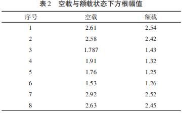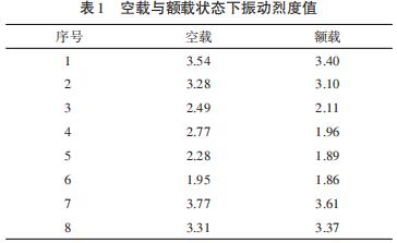 檢測時,電動葫蘆應(yīng)處于規(guī)定的運行狀態(tài),即電動葫蘆在額定轉(zhuǎn)速、額定電壓下的穩(wěn)定工作狀態(tài)。如果所測振動大于該方法所允許接受的范圍,且受過度背景干擾,應(yīng)停機進(jìn)行檢測,以確定外界的影響程度。機器靜止時所測振動烈度值(速度的均方根值)超過運行時的25%,必須進(jìn)行修正,以減少背景振動對檢測的影響。本研究選擇鋼絲繩電動葫蘆空載時對其運行狀況進(jìn)行檢測。空載運行時,將采用振動檢測的方法得到的速度的均方根值中最大值作為參考數(shù)值。此外,對選擇在空載還是帶載的情況下對電動葫蘆進(jìn)行檢測也進(jìn)行了研究。對電動葫蘆減速箱進(jìn)行檢測的同時,不考慮電動葫蘆沿軌道運行的情況,因為這時減速箱并不工作,而只考慮電動葫蘆的空載升降、帶載升降狀態(tài)。針對這樣的狀況,在試驗過程中選取了8臺電動葫蘆,分別對這8臺電動葫蘆空載上升、額載上升的兩種穩(wěn)定的工作狀態(tài)進(jìn)行振動檢測,得到振動烈度、方根幅值、平均幅值這三個主要參數(shù),并分析上述兩種狀態(tài)下這三個參數(shù),參數(shù)與分析見表1、表2、表3